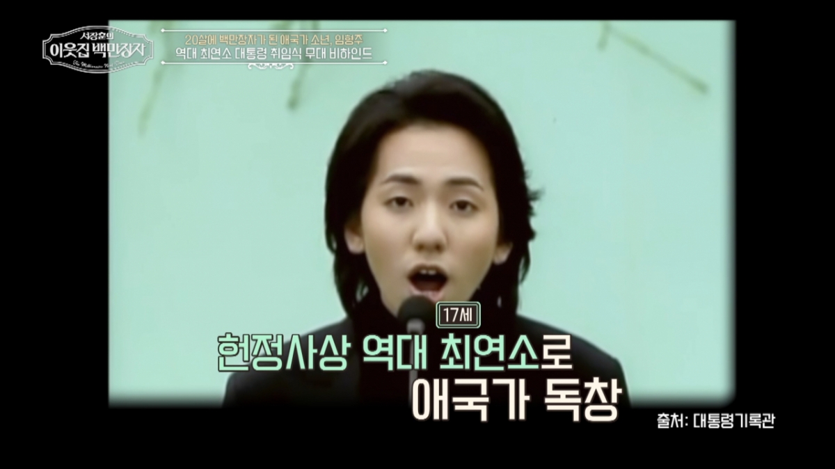 한편 임형주는 2003년 고(故) 노무현 대통령 취임식에서 '헌정 사상 역대 최연소'인 17세의 나이로 애국가를 독창했다. 이때의 모습이 많은 국민들에게 강렬하게 각인되며 임형주는 '애국가 소년'으로 일약 스타덤에 오르게 됐다.