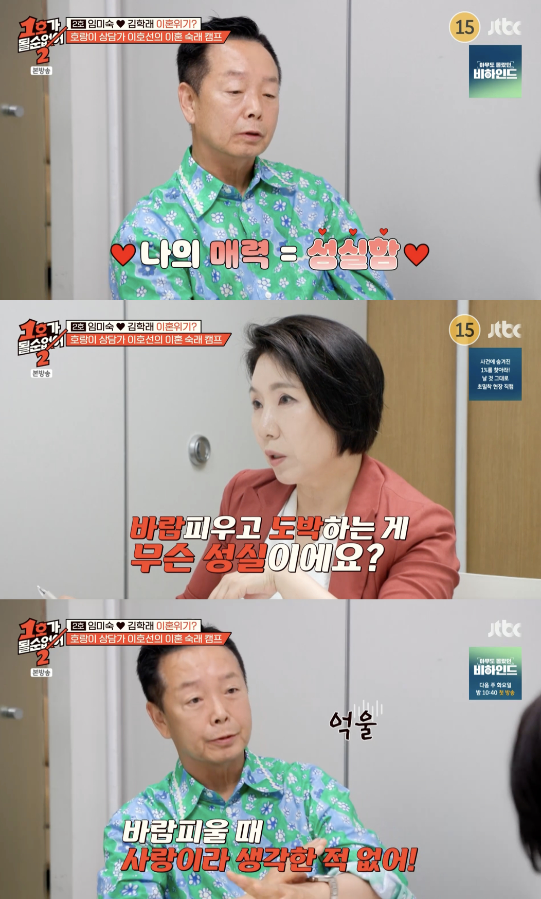 25일 방송된 JTBC 예능 프로그램 '1호가 될 순 없어2'에서는 임미숙·김학래 부부가 '이혼숙려캠프'로 얼굴을 알린 이호선 교수에게 부부 상담을 받는 모습이 그려졌다.
