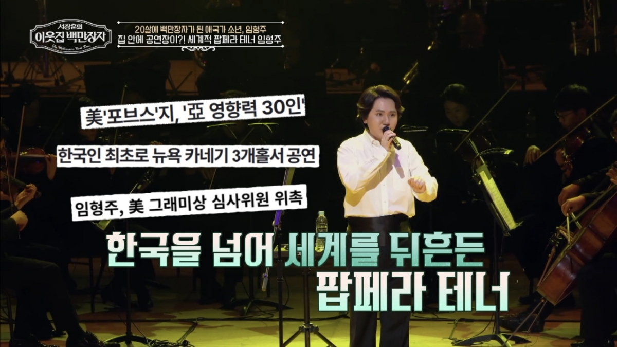 지난 25일 방송된 EBS, E채널 공동 제작 '서장훈의 이웃집 백만장자'(이하 '이웃집 백만장자')에서는 임형주의 특별한 '400평 팝페라 하우스'를 배경으로 그의 인생 이야기가 펼쳐졌다.