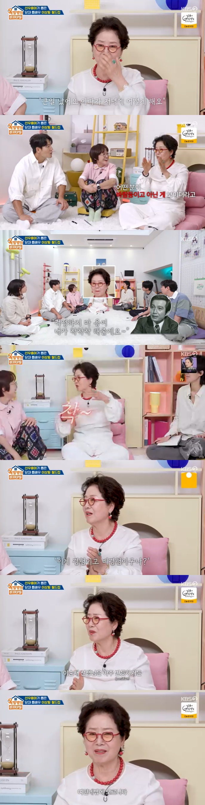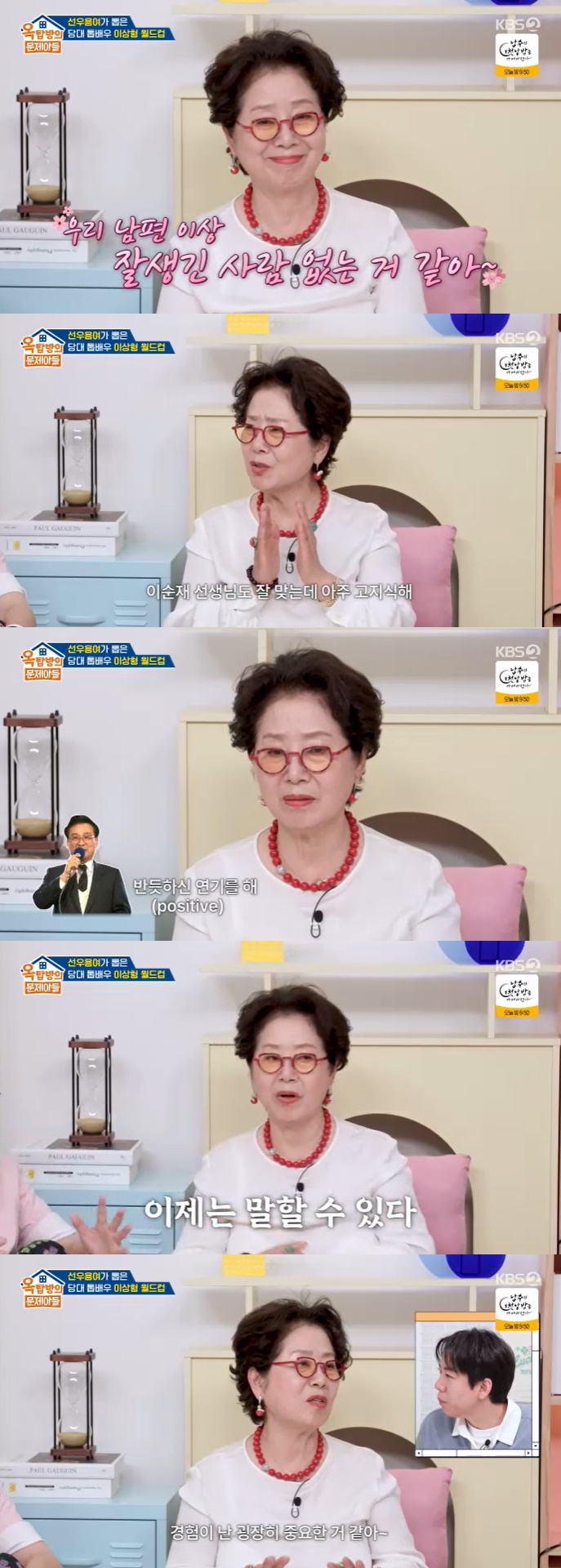 선우용여는 박근형, 신성일, 백일섭, 오지명, 이순재 등 당대 최고의 남배우들과도 연기했다면서 "우리 남편 이상 잘생긴 사람 없는 거 같아"라고 밝혔다. 연기하기 편했던 배우는 "박근형 씨"라며 "이순재 씨는 반듯했다"라고 말했다.