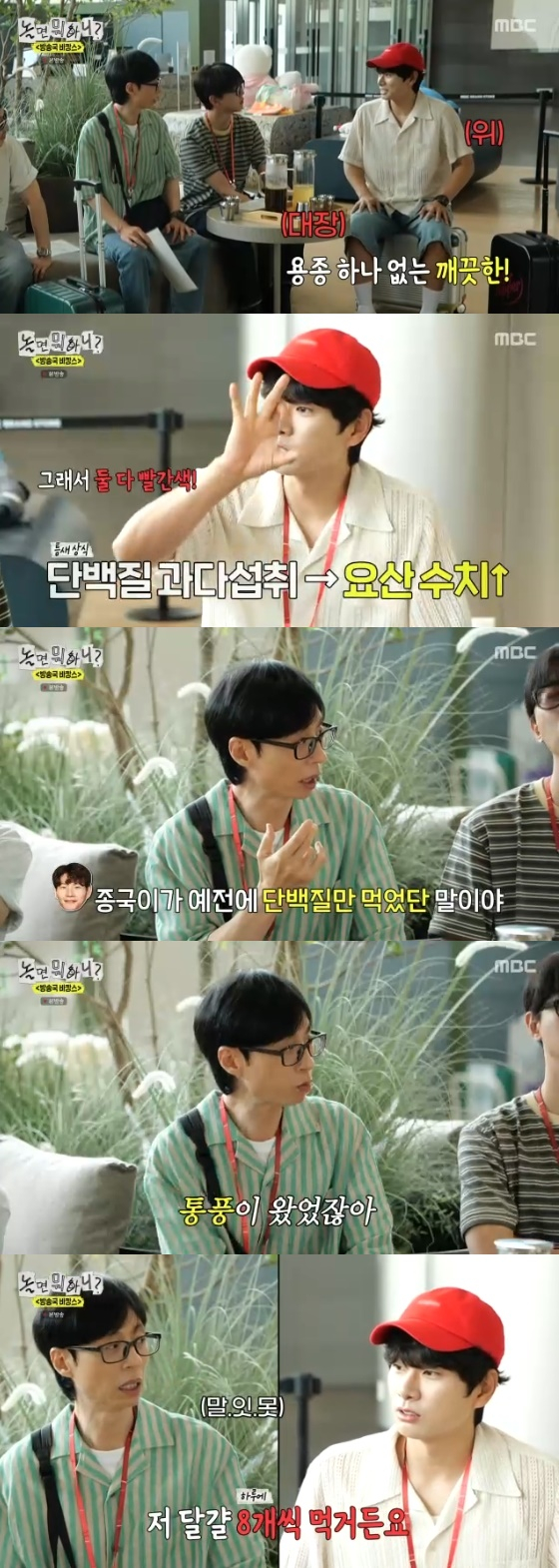 이를 듣던 유재석은 한숨을 쉬며 "단백질을 너무 많이 먹으면 요산 수치가 올라간다"며 "요산 수치가 올라가면 통풍이 온다"고 지적했다.