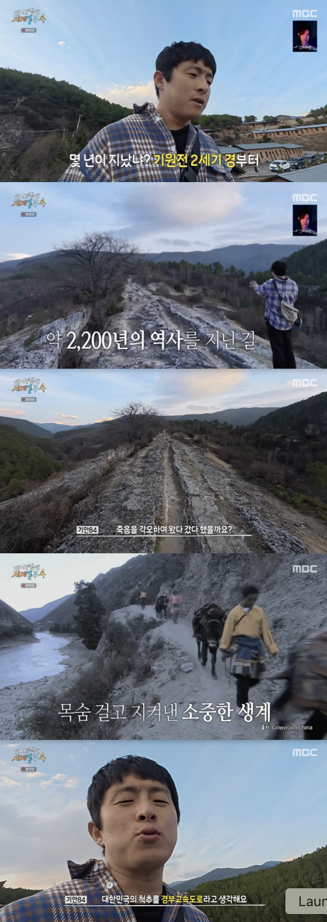 차마고도의 길 위에 발을 내디딘 기안84는 "기원전 2세기경, 2200년도 더 전에 이 길이 만들어졌다고 한다. 옆에 보면 말똥이나 소똥이 있다"며 현장을 생생히 전했다.