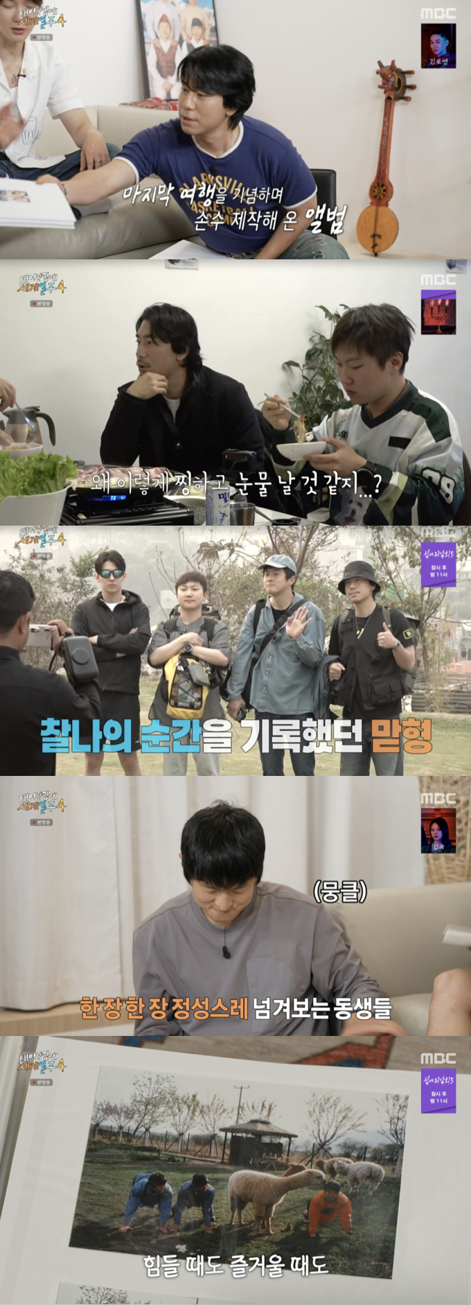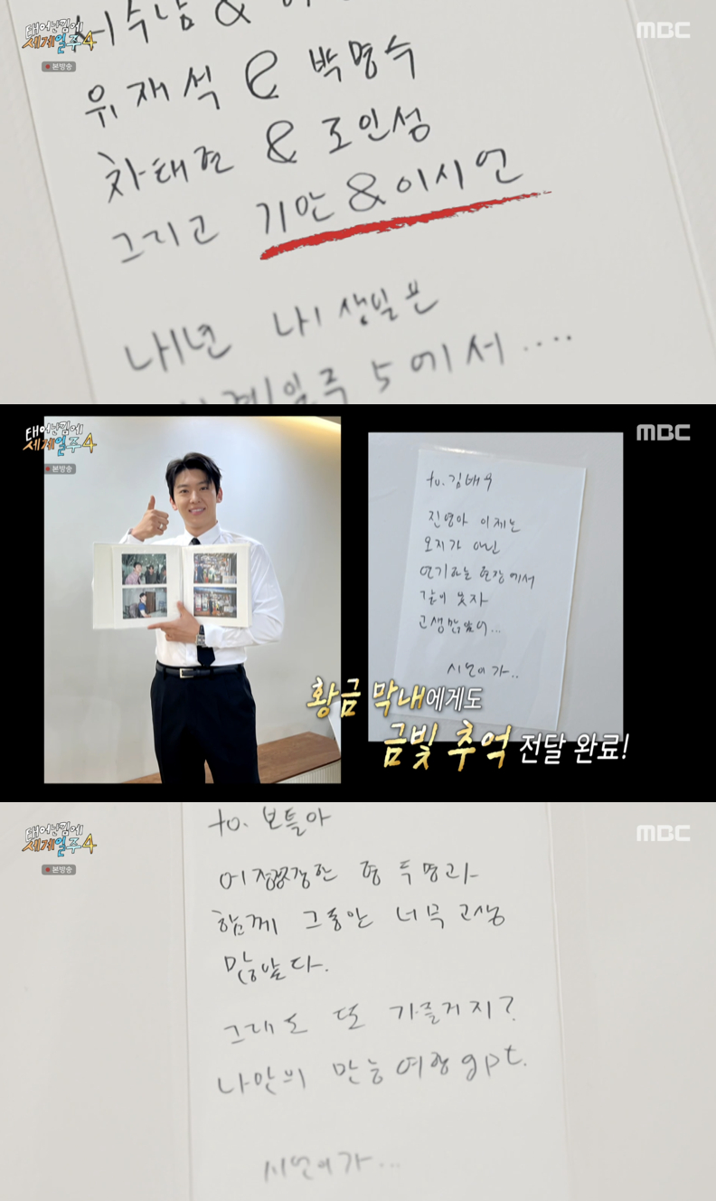 두툼한 앨범을 한 장 한 장 넘기며 "역시 남는 건 사진이다. 우리가 함께한 걸 잊지 않게 해주는 선물"이라며 멤버들에게 전했다. 이시언은 기안84에게는 '서수남과 하청일, 유재석과 박명수, 조인성과 차태현 그리고 기안84와 이시언'이라고 쓴 편지를, 빠니보틀에게는 '어정쩡한 두 명과 함께 그동안 너무 고생 많았다. 그래도 또 가줄거지? 나만의 만능 여행GPT'라는 편지를 건네며 진심을 전했다.