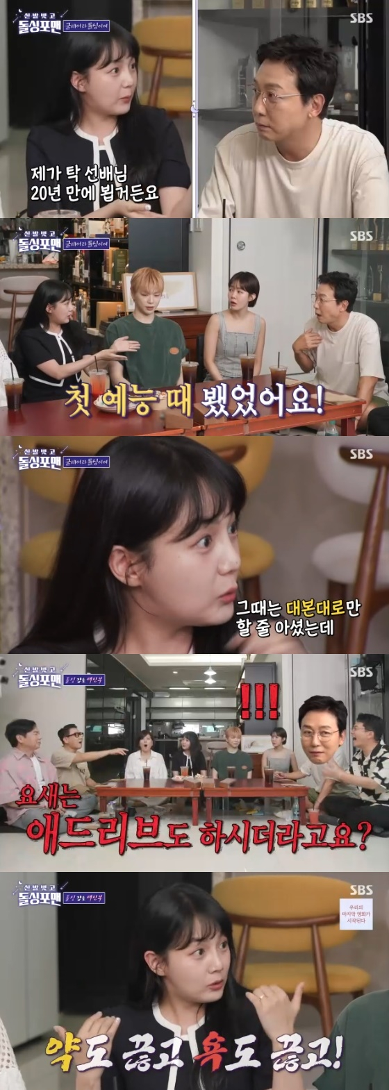 그는 과거 탁재훈과의 인연을 언급하며 "제가 선배님을 20년 만에 뵙는다. 데뷔 후 첫 예능을 나갔었는데 '상상플러스' MC를 하셨다. 그때는 대본대로만 할 줄 아셨는데 요새는 애드리브도 하시더라"라고 엉뚱한 매력을 뽐냈다.