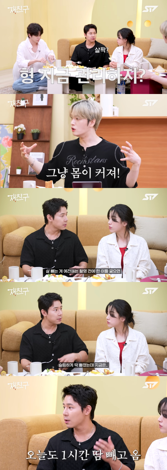 이규형은 "살짝 다이어트 중"이라고 답했고, 김재중은 "마흔 넘으면 살이 잘 찌는 것 같긴 하다. 그냥 몸이 커지고 두꺼워진다"고 털어놨다.