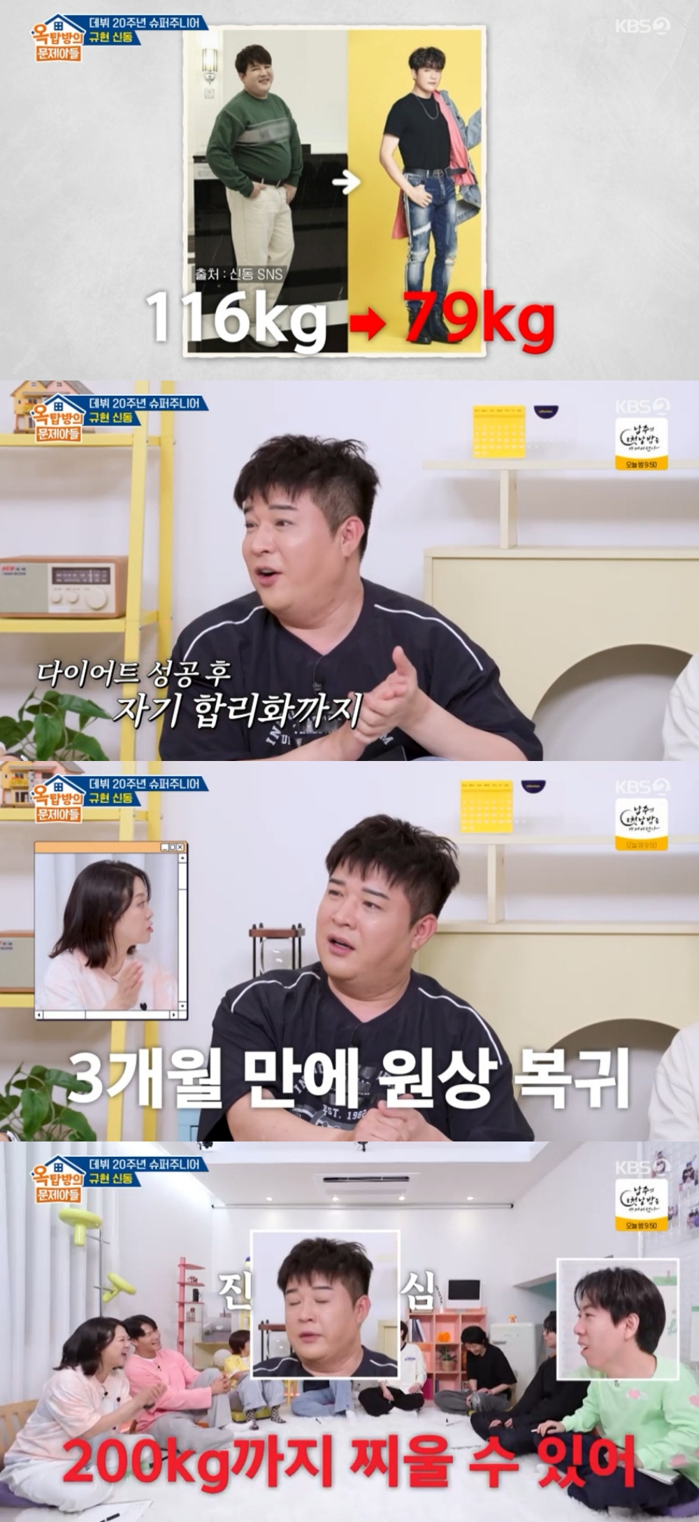 앞서 37kg를 감량했던 신동은 "116kg에서 79kg까지 뺐고, 5개월 만에 37kg를 감량했다. 운동도 했는데 식이요법을 훨씬 많이 했다. 쌈밥 위주로 먹었고, 현미 주먹밥에 멸치볶음 하나 넣어서 6알 정도 먹었다"고 말했다.