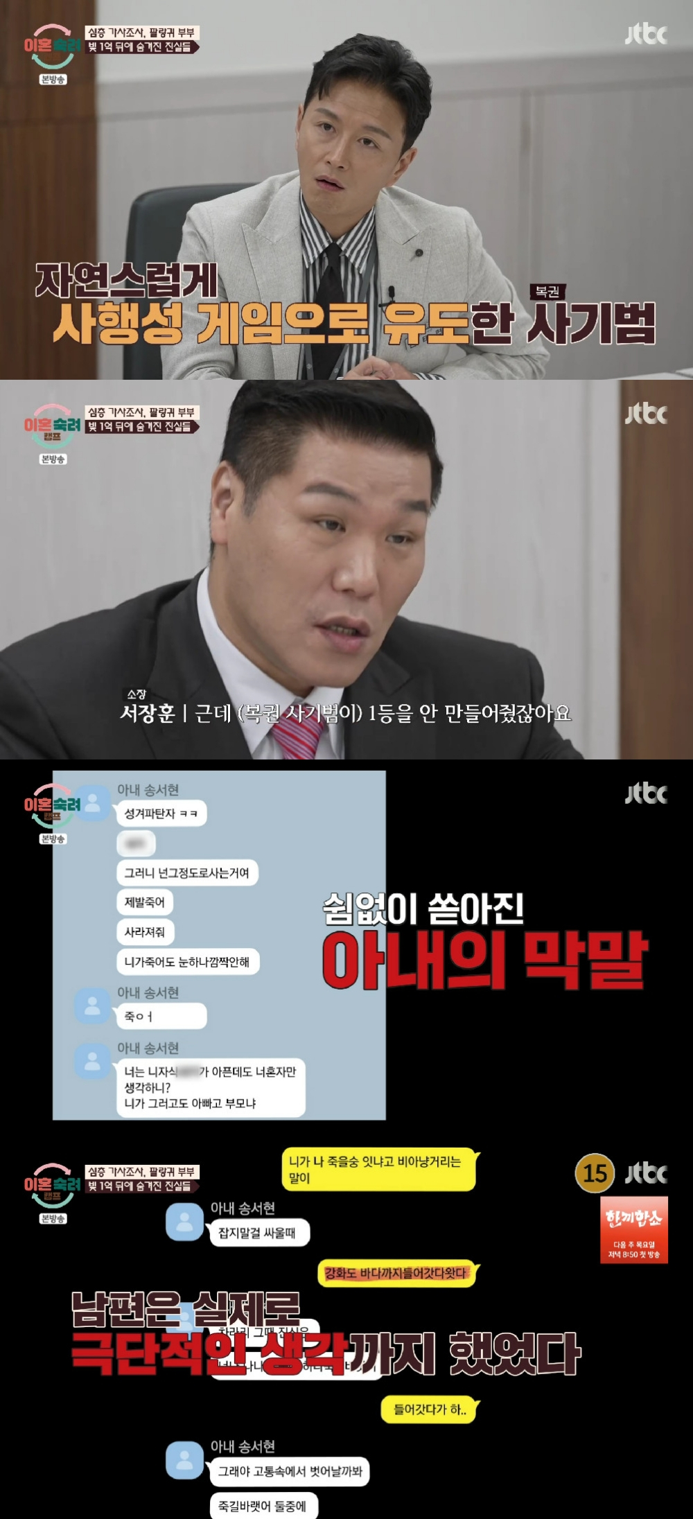 남편은 "다 갚고 없어질 때까지 잊히지 않을 거다"라고 했고, "돈 문제로 다퉈서 집에 안 들어간 날 봉평항까지 갔다. 당신이 너무 나한테 할 말 못 할 말 다 해서 끝까지 갈 뻔했다"고 했다. 이어 '제발 죽어', '사라져줘', '네가 죽어도 눈 하나 깜짝 안 해' 등 아내의 선 넘는 말들이 공개돼 충격을 안겼다.