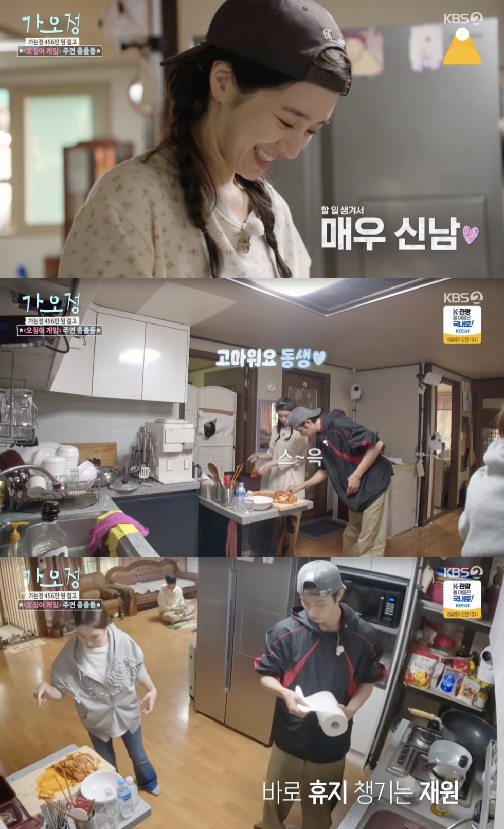 4일 방송된 KBS2TV 예능 '가는정 오는정 이민정'(이하 '가오정')에서는 넷플릭스 시리즈 '오징어게임' 시즌3 출연 배우 양동근, 위하준, 박규영이 지난주에 이어 정남매(이민정, 붐, 안재현, 김정현, 김재원)와 함께 456만원을 걸고 농촌 생활을 이어갔다.