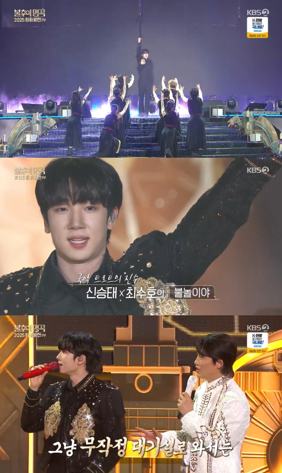 무대가 시작되고, 형형색색 화려한 조명 아래 댄서들과 함께 등장한 최수호는 파워풀한 댄스로 '불놀이야'의 막을 열었다. 웅장한 편곡에 걸맞은 강렬한 고음을 발산, 소름을 유발하는 압도적인 가창력으로 흥겨운 분위기를 돋웠다.