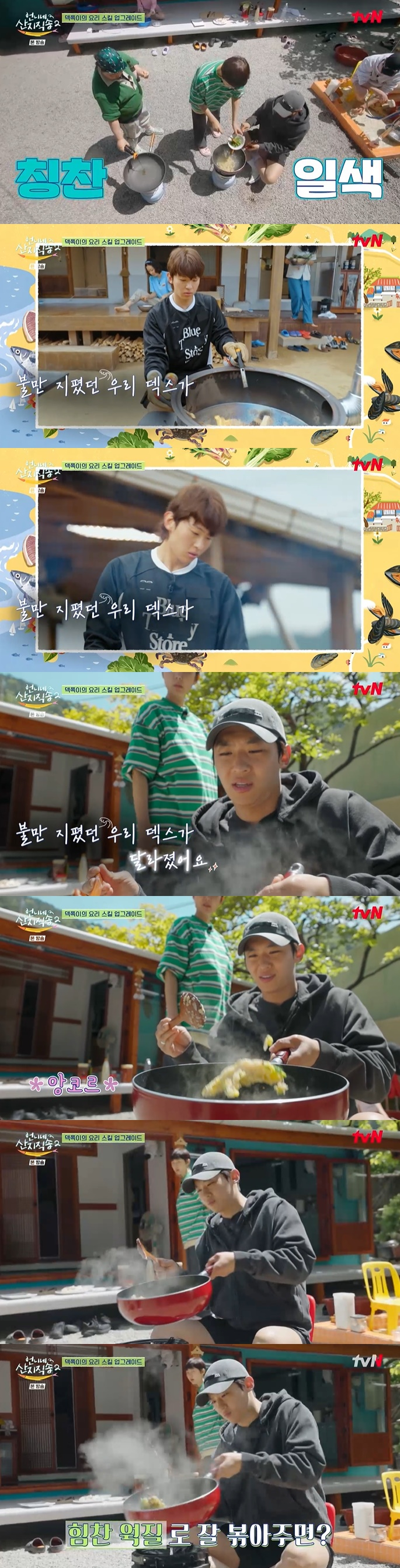 이날 멤버들은 고동강된장에 양배추쌈을 만들어 먹었다. 덱스가 화려한 스킬로 웍질을 선보이자 염정아는 "오~ 늘었어"라고 했고, 박준면도 "잘하는데?"라며 놀랐다.