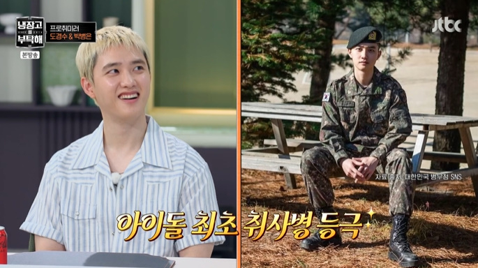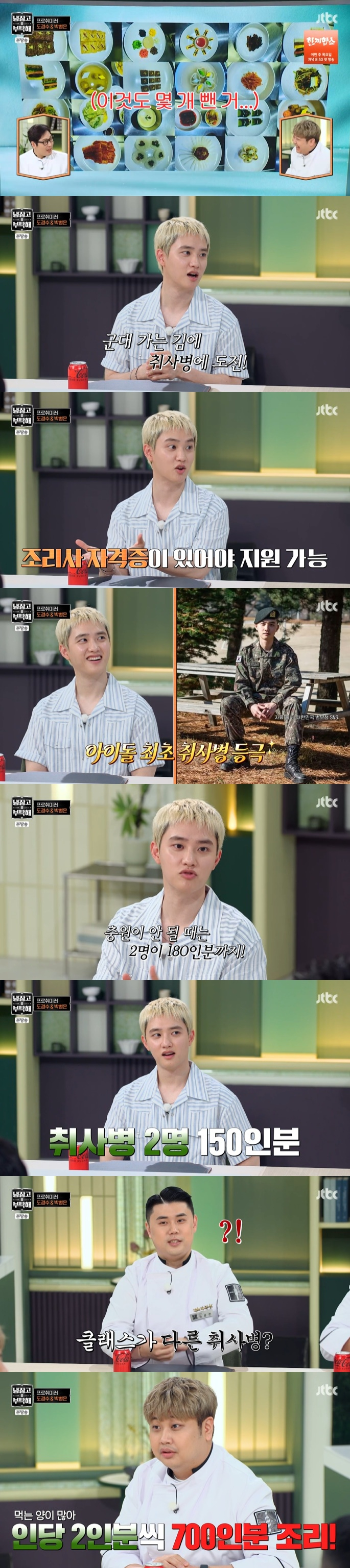도경수는 취사병이 되고 싶어서 조리사자격증을 땄다고도 말했다. 그는 "자격증이 있어야 취사병이 될 수 있더라. 기본 4명이 180인분을 만들었고, 2명이서 180인분을 만들기도 했다"고 말했다.