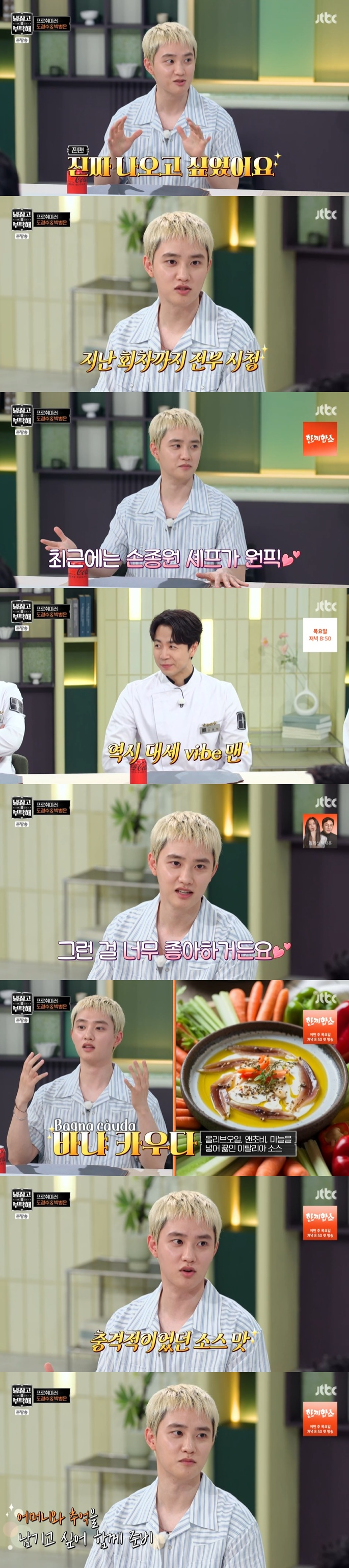 도경수는 오래 전부터 '냉부해' 애청자였다며 "최근에는 손종원 셰프님을 잘 봤다. 요리하실 때 깔끔하게 하면서 요리하는 걸 보고 좋았다"라고 말했다.