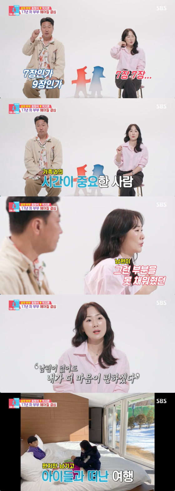 박지윤은 이에 대해 "저 혼자 이별 여행을 떠났다"며 "저는 가족과 시간이 중요한 사람인데 남편이 그런 부분을 못 채워줬다"고 말했다.