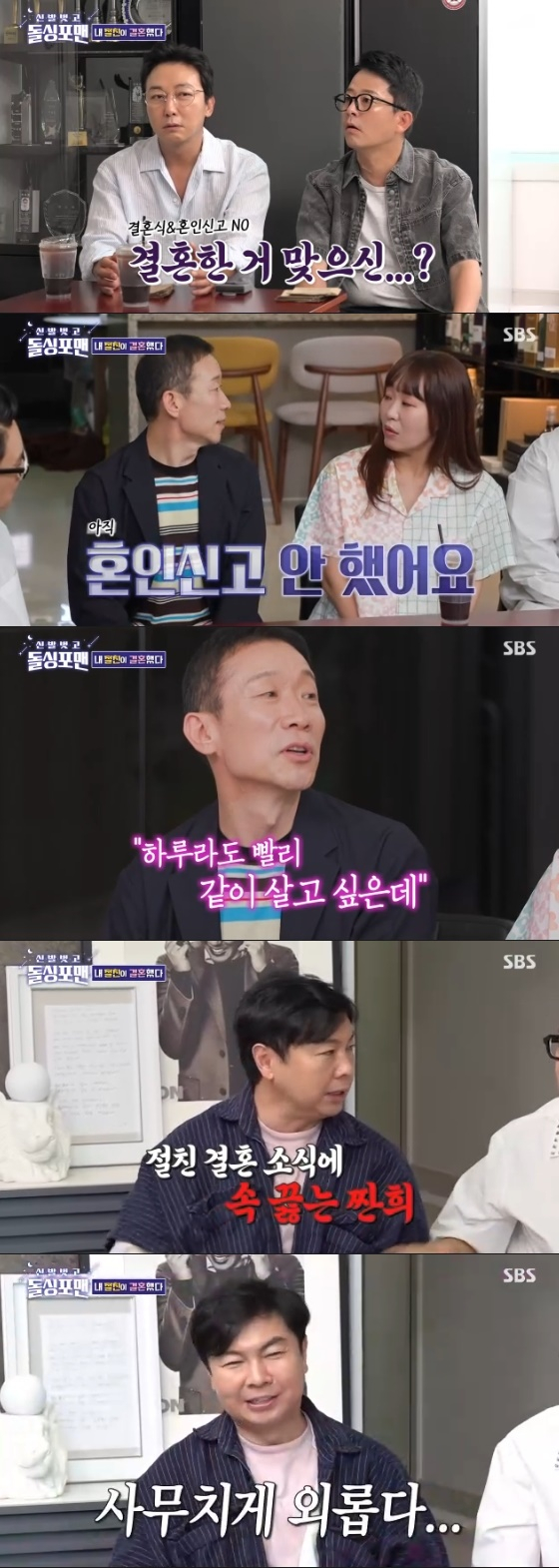 이날 탁재훈은 최근 서둘러 결혼한 정석용을 향해 "결혼식을 하고 혼인신고를 하는 절차가 있는데 어떤 게 가장 급했던 거냐"라고 짓궂은 질문을 던졌다.