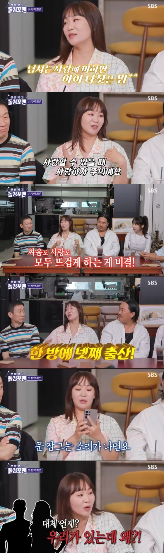 이날 정주리는 "저희는 시도 때도 없이 씨를 뿌린다"라며 "많이 사랑한 것에 비하면 아이가 다섯인 건 얼마 없는 거다. 저희는 사랑할 수 있을 때 틈나는 대로 사랑하자는 주의다"라고 밝혀 분위기를 후끈하게 만들었다.