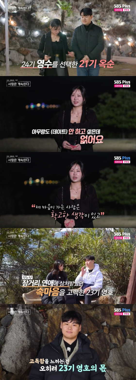 이어 "제 마음이 가는 23기 영호는 자신의 생각이 확고하다. 그 마음을 꺾을 수 없을 것 같다"며 "24기 영수한테 마음이 있었지만 23기 영호에 대한 마음이 더 커서 제 마음을 확실히 알리기 위해 선택했다"고 설명했다.