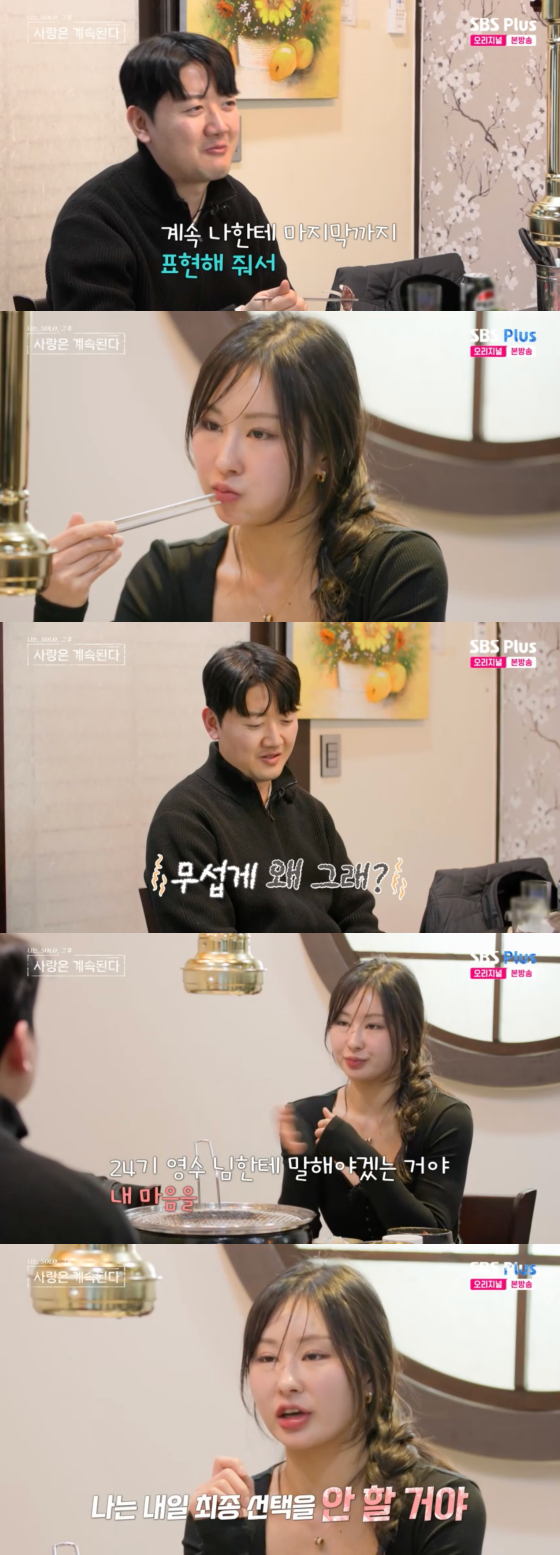 이어 "결론부터 말하자면 나는 내일 최종 선택을 하지 않을 것"이라고 밝힌 후 "나는 처음부터 23기 영호가 궁금했고, 호감이 더 많이 갔다. 그렇다고 24기 영수를 대한 게 가식은 아니고 진심이었다"고 털어놨다.