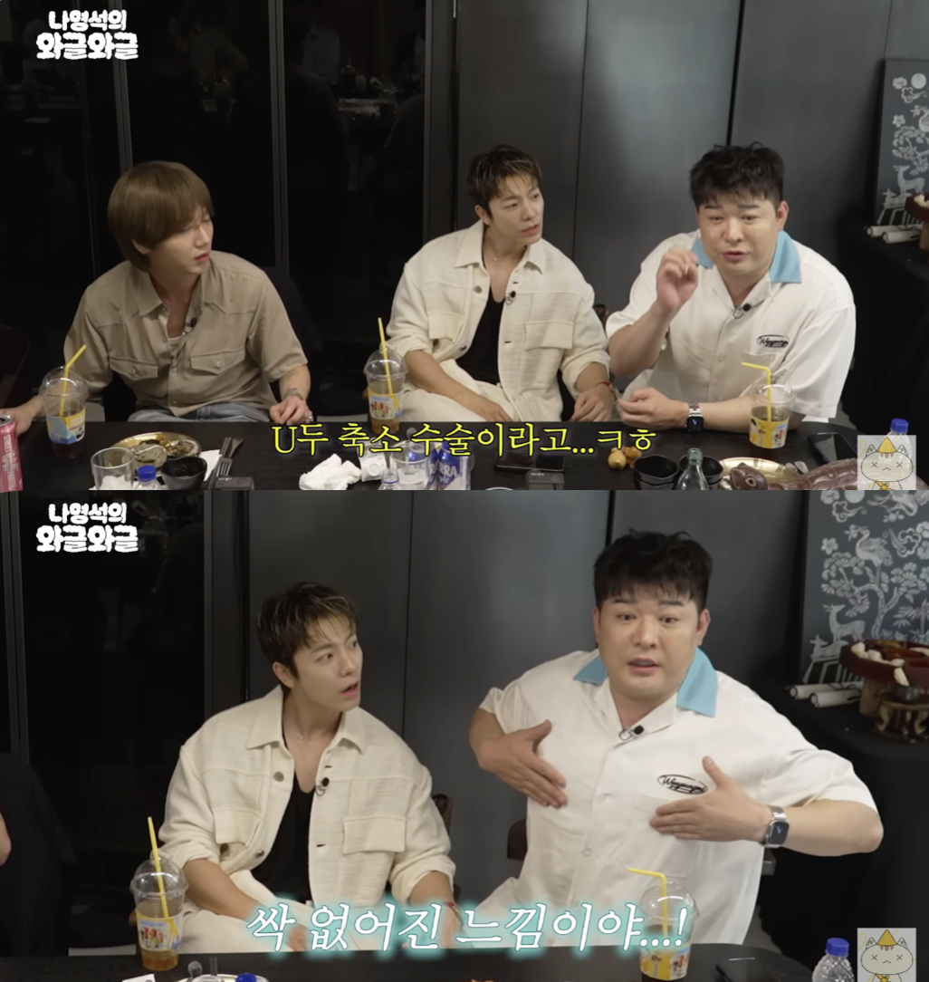 이어 신동은 유두축소수술 사실을 깜짝 고백하기도 했다. 그는 "너무 강력하니까 연하게 했다. 이거를 좀 축소시켜준다. 처음 수술하면 싹 없어진 느낌이다. 그런데 병원에서는 말하기로는 다시 나온다고 하더라. 나 수술 많이 했다"라고 솔직하게 털어놔 출연진들을 놀라게 했다.