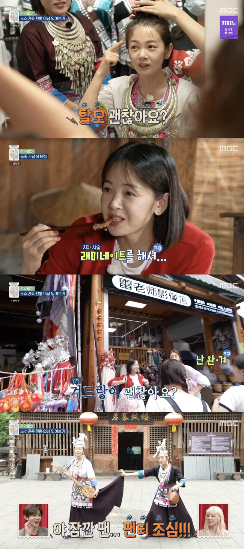 이어 멤버들은 전통 의상 대여소를 찾아 중국 전통 복장 체험에 나섰다. 민소매 디자인이 많은 의상들을 살피던 김보미는 갑자기 "겨드랑이 괜찮아요? 보여주세요"라며 멤버들에게 솔직하게 묻는 등 특유의 털털한 매력을 뽐냈다.