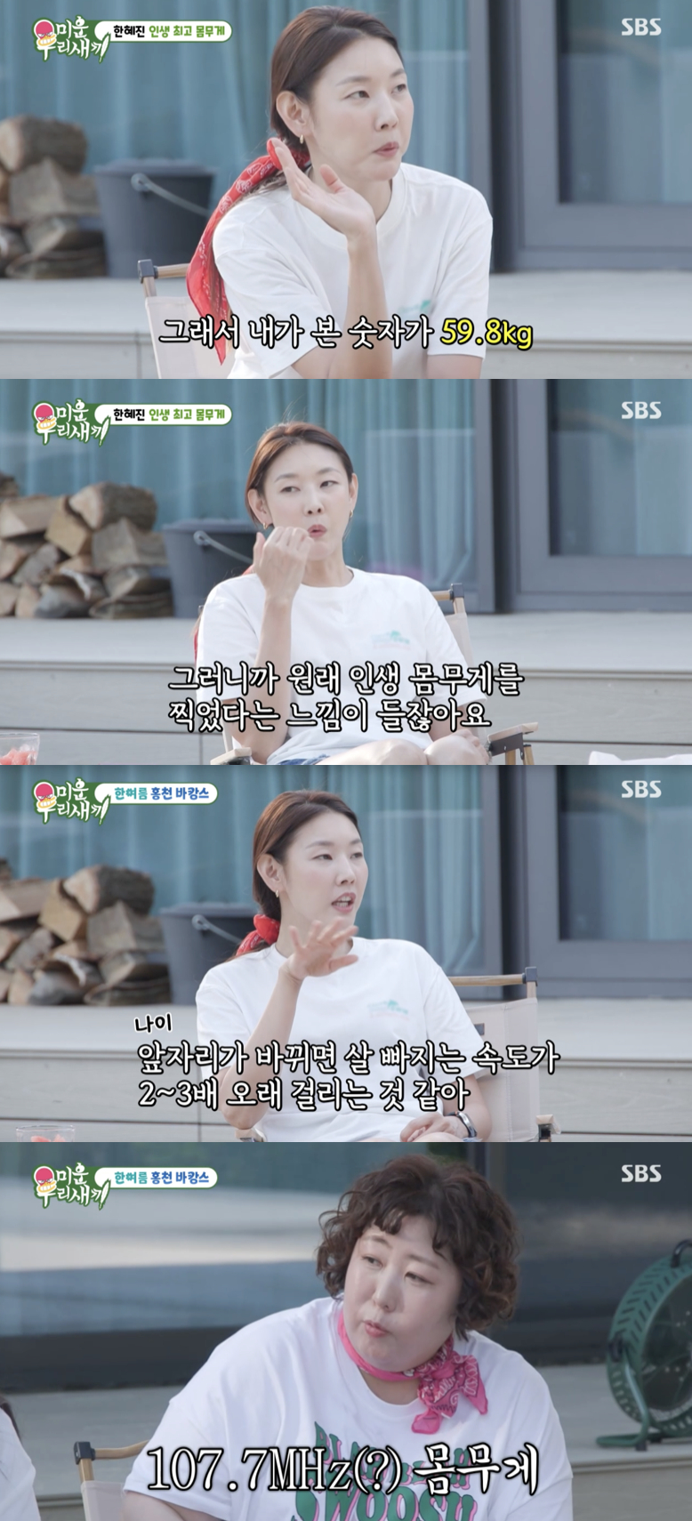 이에 한혜진은 "각자 본인한테 편안한 체중이 있지 않냐. 나 같은 경우는 시즌이랑 비시즌의 중간쯤이 편하다"고 했다. 그러자 신기루는 오히려 한혜진에게 "네 최고 인생 몸무게가 몇 kg냐"고 기습 질문을 던졌다.