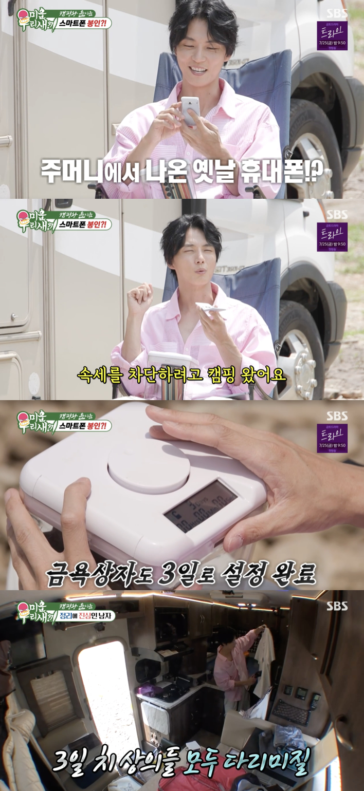 그는 준비해 온 2G 폴더폰으로 회사 관계자에게 전화를 걸어 "속세를 차단하려고 캠핑에 왔다. 드라마를 몇 달간 찍다 보니 사람들도 만나서 놀고 싶더라. 그런데 바로 연극 들어가니까 마음이 풀어지면 안 될 것 같았다. 역할과 감정에 집중하려 한다"며 이번 캠핑의 이유를 진지하게 밝혔다.