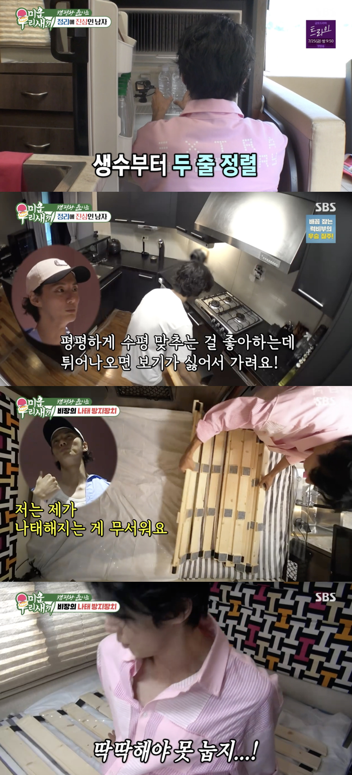 냉장고 안의 음료와 생수도 짝수로 맞춰서 깔끔하게 정리했고, 수평을 맞추는 것을 좋아한다며 캠핑카 가스레인지 위에 덮개를 가져와 덮는 철저함을 보였다.
