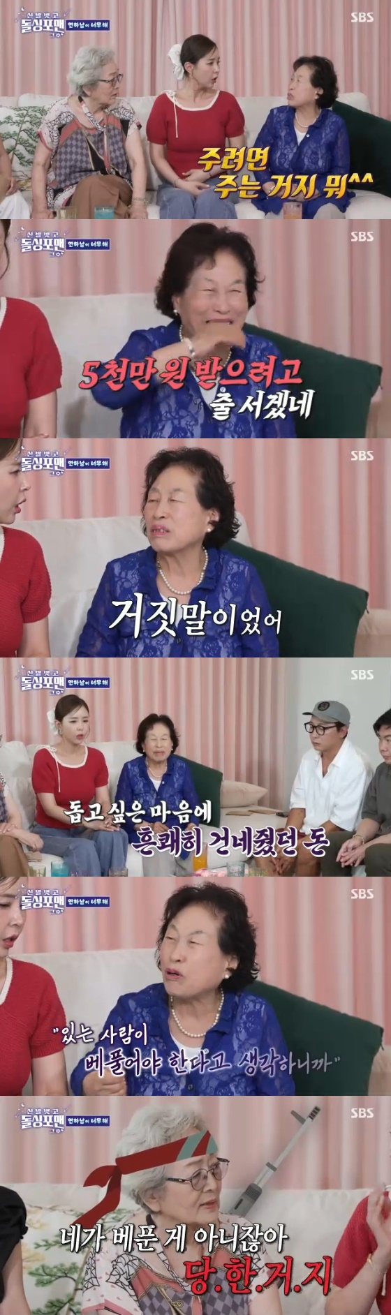 그러나 김영옥은 "네가 지금 베푼 게 아니지 않느냐. 당한 거다. 젊은 애가 아프다니까 좋은 마음으로 희생한 게 아니라 엄한 마음을 먹고 준거다"라고 팩폭을 날려 현장을 웃음바다로 만들었다. 이를 듣던 전원주는 "내가 보이지 않게 돈 많이 쓴다"고 대꾸했으나 김영옥은 "나는 못 믿어"라고 받아쳐 웃음을 유발했다.