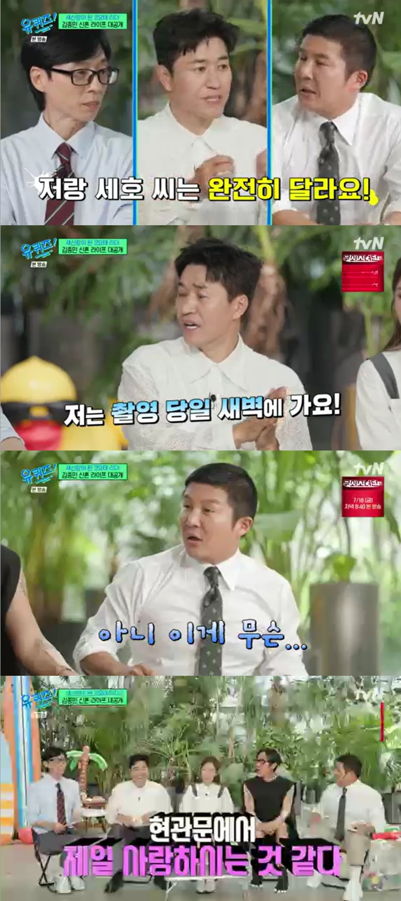 이어 그는 "너무 다른 게, 조세호는 KBS 2TV '1박 2일' 촬영할 때 컨디션을 위해 전날에 먼저 촬영장에 간다. 근데 저는 촬영 당일 새벽에 간다. 제 아내는 조금이라도 저랑 같이 있고 싶어한다"라고 얘기했다.