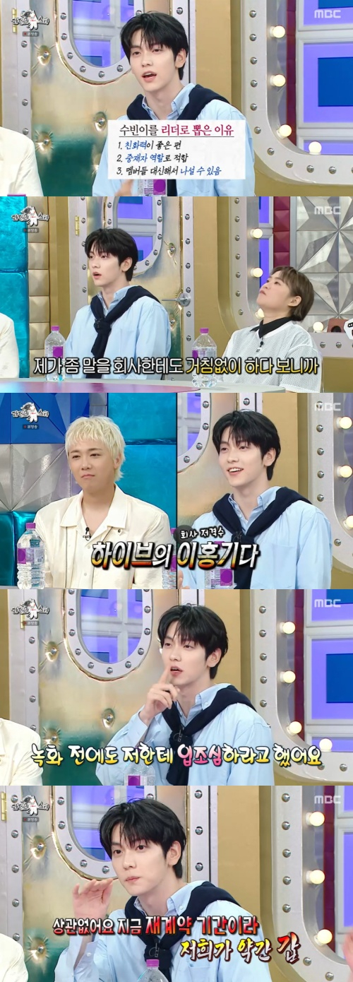 수빈은 "신인개발팀 직원, 멤버 만장일치로 리더가 됐다. 제가 회사한테도 말을 거침없이 하다 보니까 '하이브의 이홍기'라는 얘기를 듣는다"고 밝혔다.