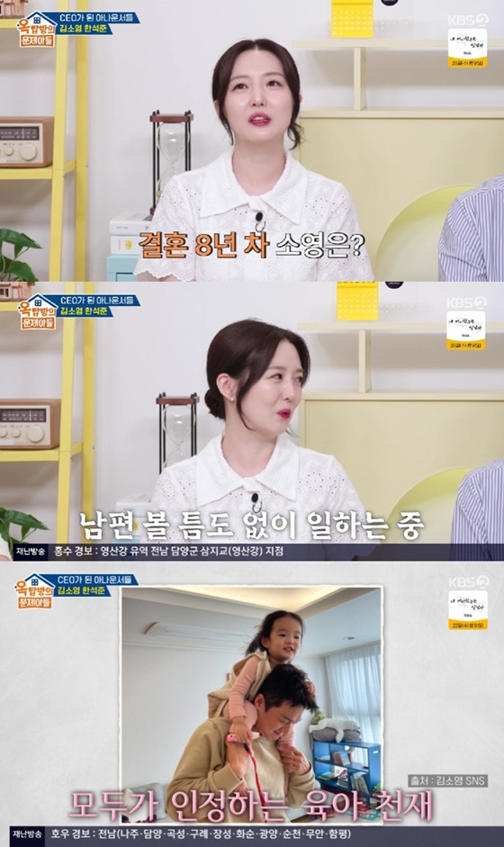 김소영은 "영국 여행에서 임신 사실을 알게 됐다. 그때는 사업을 안 할 때라 시간이 많아서, 첫째가 순탄하게 생겼다. 이후로는 낮과 밤이 달라서 많이 못 보고 있다"고 했다.
