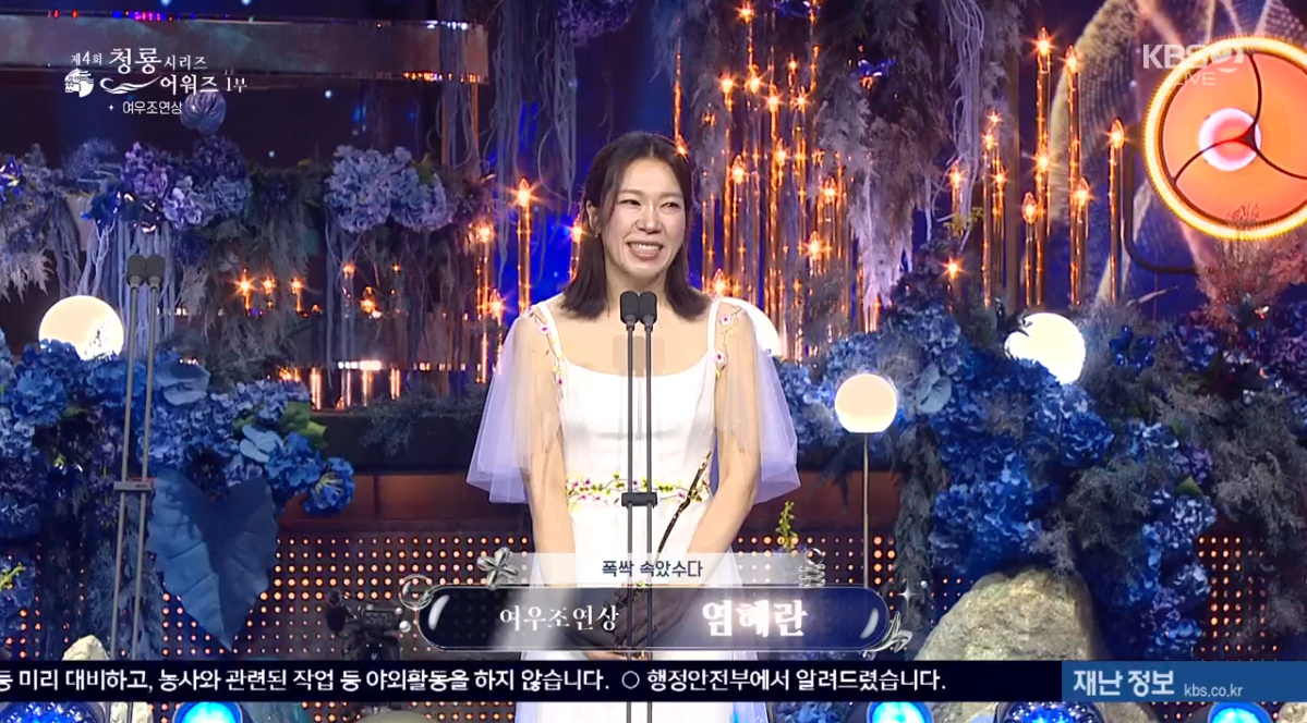 배우 염혜란이 제4회 청룡시리즈어워즈(Blue Dragon Series Awards)에서 여우조연상을 수상했다.