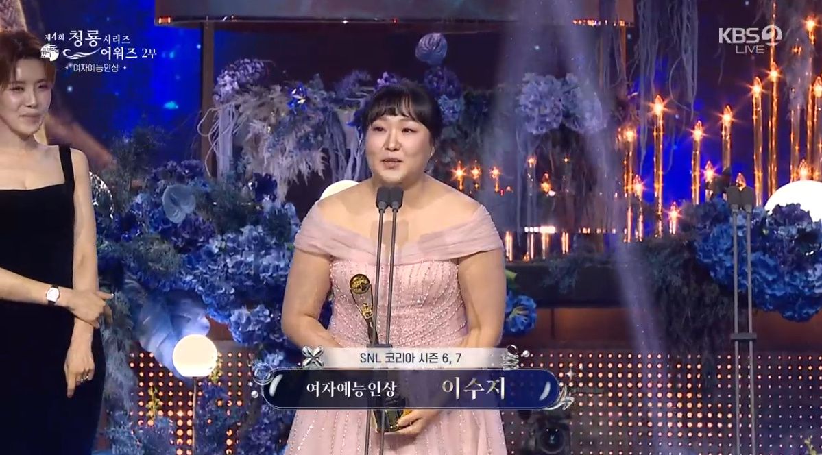 여자예능인상을 수상한 이수지는 "'SNL'이 200명 넘는 식구들이 밤을 새서 웃음 위해 노력한다. 완성형 웃음 위해 노력한다"라며 감사함을 더했다.