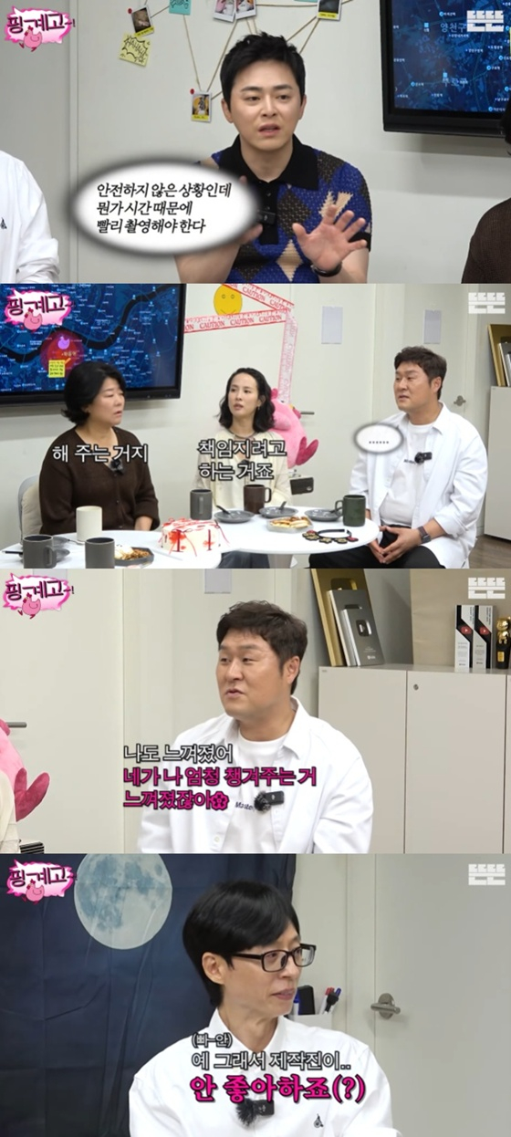 이날 조정석은 가장 최근에 화났던 일에 관해 묻자 "저도 몰랐는데 안전하지 않은 상황인데 시간 때문에 빨리 촬영해야 한다고 하면 극심한 스트레스를 받는다"고 밝혔다.