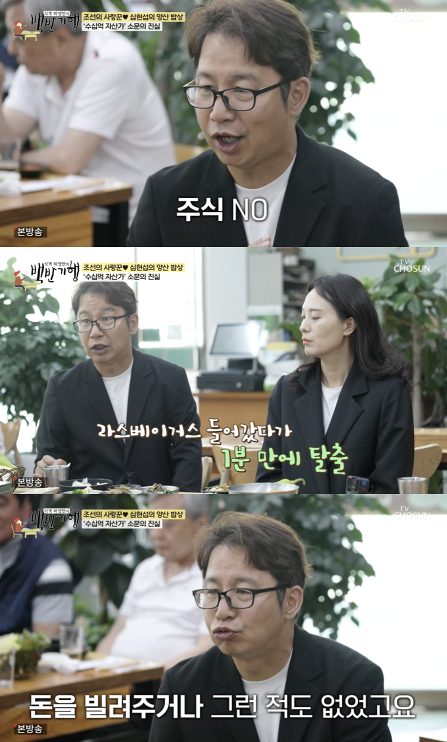 허영만이 "대부분 연예인들이 딴짓하다가 다 까먹더라"고 하자, 심현섭은 아내 정영림을 힐끔 보며 "주식 한 거 없다. 저는 고스톱도 못 친다. 라스베이거스에 들어갔다가 현기증 때문에 1분 만에 나왔다. 누굴 빌려준 적도 없다. 어디 간 거지?"라며 돈의 행방에 대해 스스로도 궁금해하는 모습을 보여 웃음을 자아냈다.