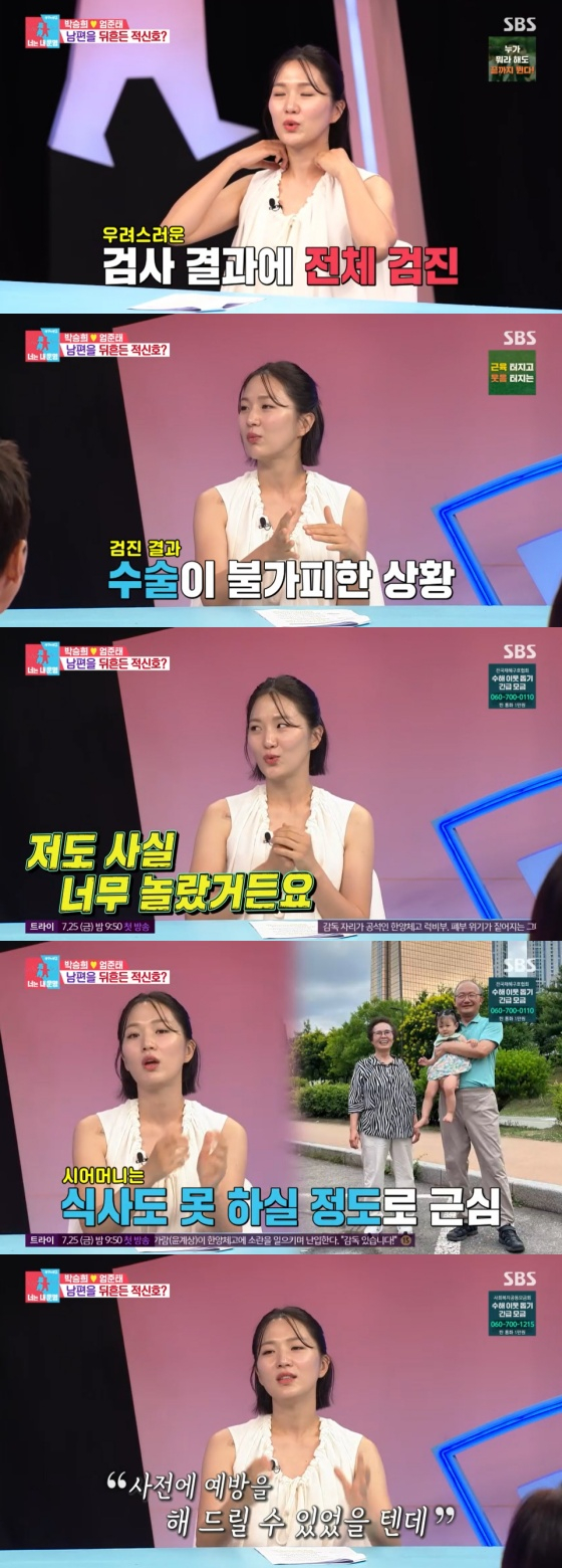 박승희는 또 "그래서 아버님 병원도 제가 다 알아봐서 예약을 하고 그랬다. 최대한 노력했는데 남편은 '우리가 좀 더 잘했더라면 예방할 수 있었을 텐데' 하는 마음인 것 같다"고 힘든 속내를 털어놨다.