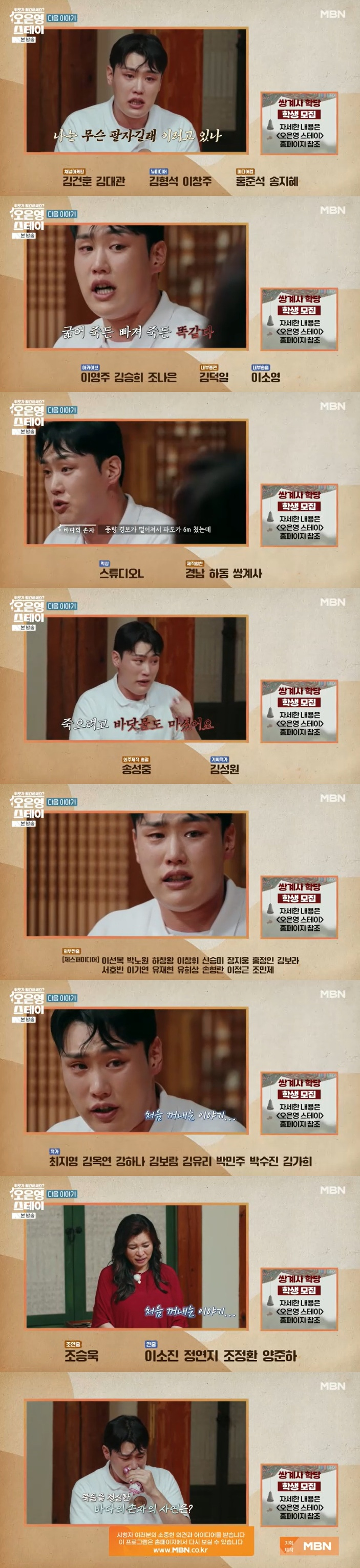 그는 이어 "'굶어 죽으나 빠져 죽으나 매한가지다' 생각했다. 풍량 경보가 떨어져서 파도가 6m 쳤는데 제가 (물에) 빠졌다. 제가 죽으려고 물도 막 마셨다. 그런데 파도가 저를 쳐서 바위 위로 올리더라"라고 일화를 밝히며 오열했다.