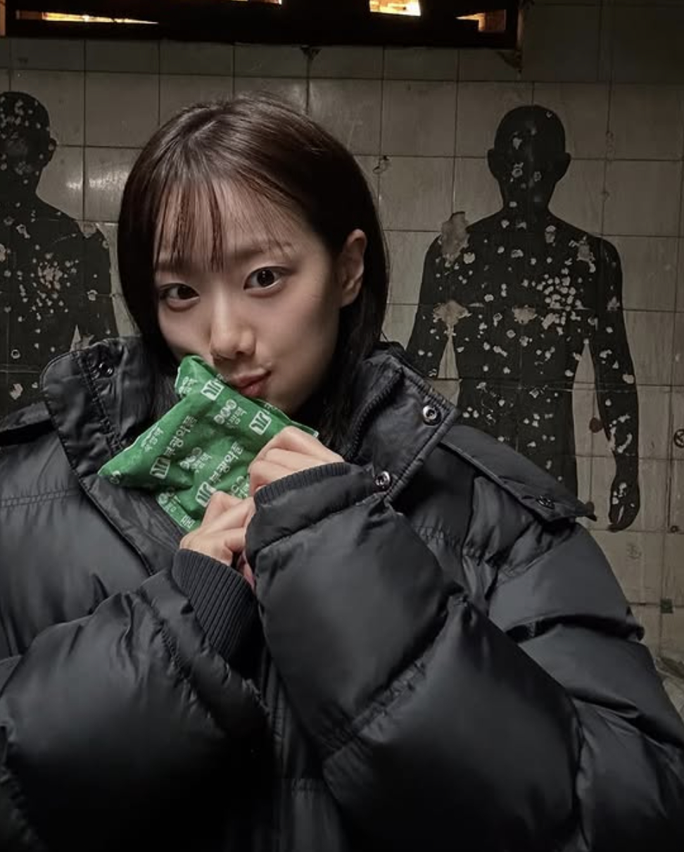 또 다른 컷에서는 두꺼운 패딩 점퍼를 입고 핫팩을 손에 든 채 추위를 견디는 모습이 담겨 있어, 당시 촬영 현장의 날씨가 꽤나 추웠음을 짐작케 한다.