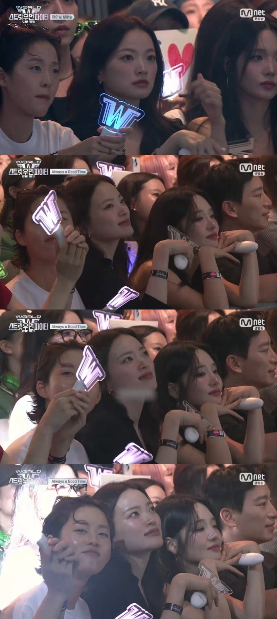 그중에서도 단연 눈길을 끄는 이는 천우희였다. 그는 자신의 얼굴이 카메라에 잡히자 동료 이연과 함께 환하게 웃으며 응원봉을 흔들었다.