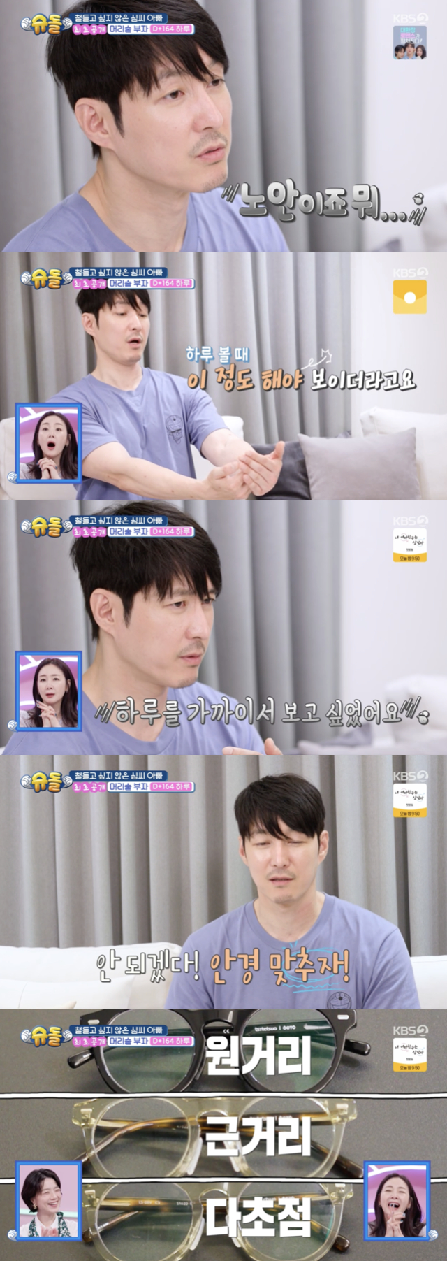 그는 이어 "하루를 볼 때는 이 정도로 멀리 안아야 얼굴이 보이더라. 하루를 가까이서 보고 싶었다"며 원·근·다초점 등 3종류의 안경을 맞췄다고 밝혀 모두를 놀라게 했다. 이를 들은 박수홍은 "난 다초점만 맞췄는데 3개나 맞췄다고?"라며 감탄했다.