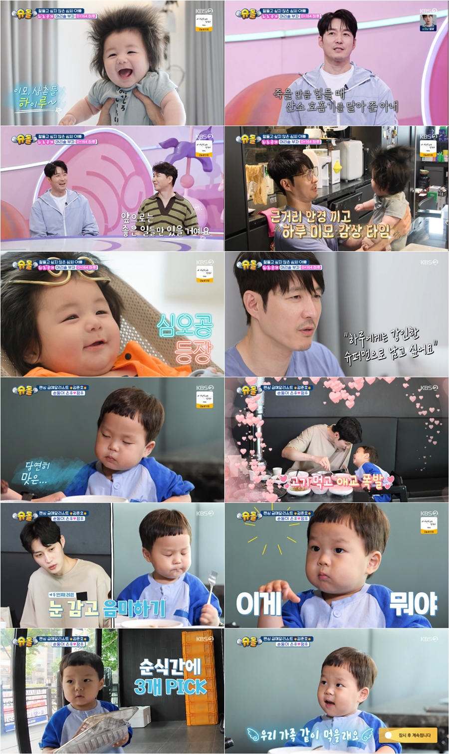 '48세 늦깎이 아빠' 심형탁은 "아내 사야는 제가 숨쉴 수 있게, 다시 일어날 수 있게 도와준 사람"이라며 일본인 아내 사야와의 러브스토리를 공개했다. 특히 "내 삶의 이유가 된 하루라는 선물을 줬다"라며 태어난 지 164일째인 아들 하루를 공개해 감탄을 터지게 했다. 하루는 엄마와 아빠의 미모를 골고루 닮은 비주얼 천재로 존재감을 발산했다. 사자갈기처럼 풍성한 머리숱과 천사 같은 미소, 토실 토실한 뒤태가 심장을 어택했고, 생후 6개월에 9.9kg을 달성하며 '슈돌' 아이들 중에서도 상위 1%인 자이언트 베이비임을 입증했다. 최지우는 "토실토실하니 너무 귀엽다. 소시지 같아 너무 귀여워~"라며 감탄을 멈추지 못했다.