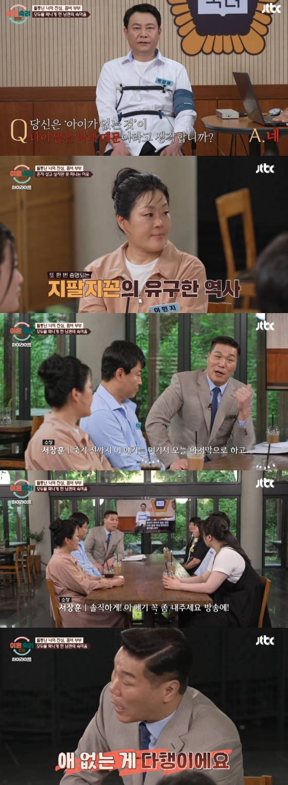 이날 역대급 술 주사로 모두를 놀라게 한 좀비 부부 남편은 "아이가 없는 것이 나이 많은 아내 탓이라 생각하냐"는 질문에 "네"라고 답했다.