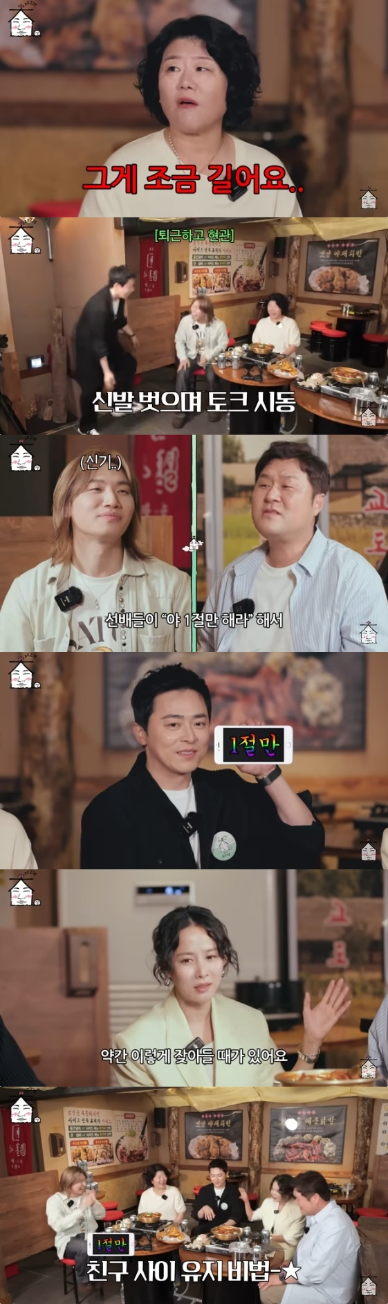 윤경호는 "대학교 때 선배들이 '야, 1절만 해라'라고 해서 별명이 '1절만'이었다. 내가 정석이랑 촬영장에서 만나 너무 반가워서 수다를 떠는데 어느 순간 '이러면 사이가 멀어지겠다' 싶어서 말을 좀 참았다. 나중에 한참 시간이 지나고 이정은 선배님과 여정이 앞에서 신나게 얘기를 하는데 옆통수가 따가워서 보니까 정석이가 핸드폰에 '1절만'이라는 글자를 써서 들고 있더라"라고 일화를 소개해 폭소를 유발했다.