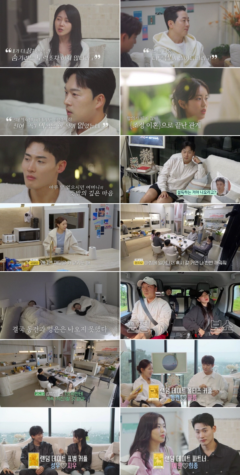 다음으로 아름은 "순탄한 결혼 생활을 이어가던 중 전 남편에게 신뢰를 잃을 만한 일이 생겼고, 그 생각이 머리에서 떠나질 않아 이혼하게 됐다"라고 덤덤히 얘기했다. 도형은 "결혼 직후 해외로 나가게 돼 단둘이 신혼살림을 시작했는데, 여러 문제로 많이 싸웠다. 그런데 기댈 데가 서로밖에 없다 보니, 그게 함정이 됐다"라며 해외살이에 팬데믹까지 덮쳐 힘들었던 시절을 떠올렸다. 명은은 "결혼 후 어떤 일이 생기면서 그로 인해 매일 같이 싸웠다. (전 남편과) 관계 유지를 위해 할 수 있는 걸 다 해봤지만, 건강이 급격히 안 좋아져서 양가 부모님께 말씀드리고 이혼을 결정했다"라고 눈물을 글썽였다. 무거운 분위기 속, 인형은 "결혼할 때 양가 경제 규모가 좀 차이가 났다. 저희 부모님께서 여러모로 지원을 많이 해주셨다. 그러던 중, 직장 때문에 주말 부부가 됐는데, 어느 날 평소보다 빨리 집에 가니까 아내가 반기질 않고 짜증을 내는 거다. 거기에 남자 인기척까지 느껴졌다"라고 해 모두를 충격에 빠트렸다. 동건 역시 "전 아내가 유부녀란 사실을 숨긴 채 다른 남자들과 연락하고 지내는 걸 알게 돼 신뢰를 잃었다"라며 결혼식도 올리기 전 이혼해야 했던 사연을 전했다.