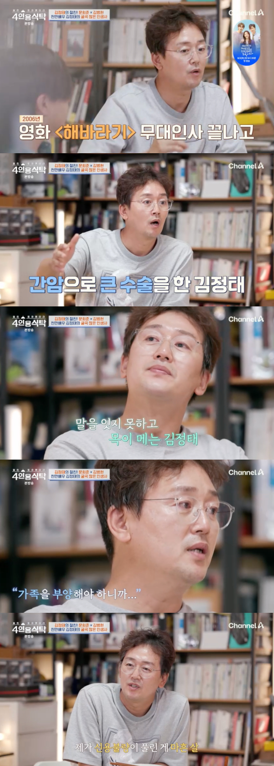 이에 박경림이 "어떤 게 그렇게 스트레스였냐"고 묻자 김정태는 "가족을 부양해야 하는 것"이라고 답하며 눈시울을 붉혔다.