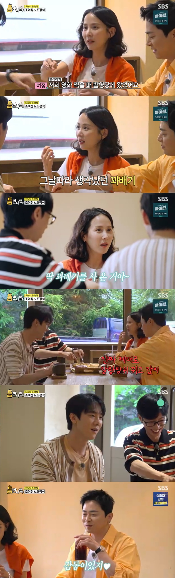 조여정은 유연석을 보고 "저희 촬영장에 왔다"라며 "나 그날 너무 신기한 게, 시장 꽈배기를 먹고 싶어서 배달 앱에서 보고 있었다. 그런데 (유연석이) 꽈배기를 사 온 거다"라고 말했다.