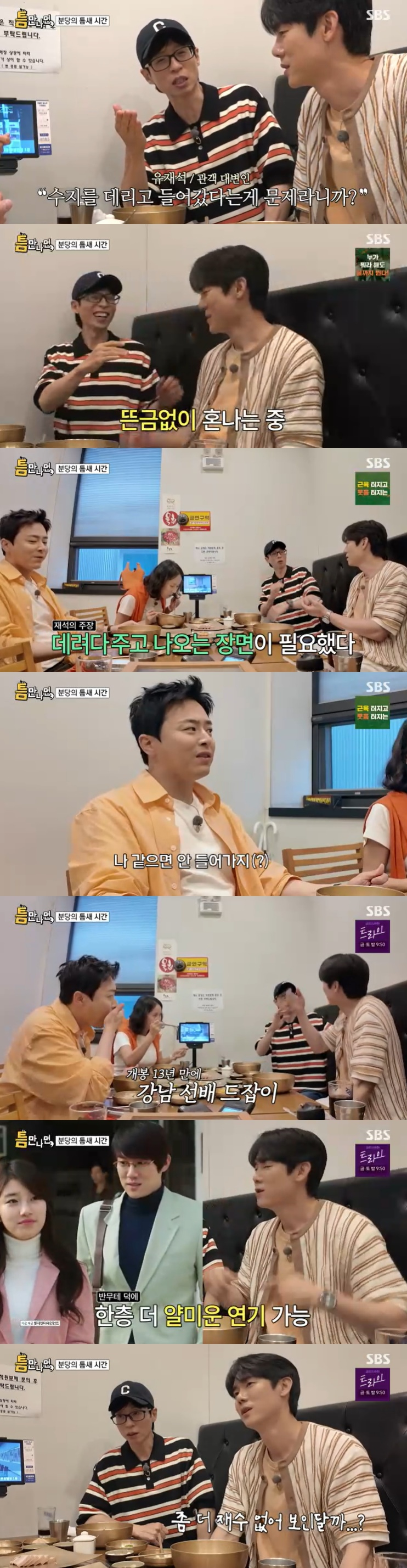 이에 조정석은 "진짜 제대로 알랑방귀 뀌고 갔지"라고 유연석을 놀렸다. 유연석이 "아 형"이라고 하자, 조정석은 "너무 감동이었지"라고 너스레를 떨었다.