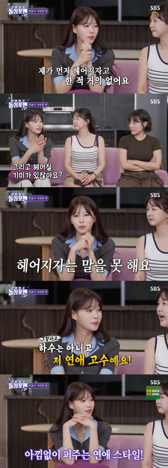 그는 "제가 생각할 때 저는 연애할 때 다 퍼주는 스타일"이라며 "예를 들어 남자친구가 팀이면 40명, 50명 되는 팀원들한테 햄버거 다 사주고 콜라까지 사서 들고 찾아간다"고 설명했다.