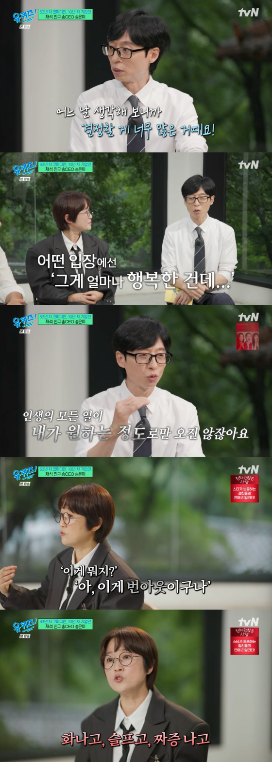 이를 듣던 송은이 절친 유재석은 "저도 너무 감사하게도 많은 일을 하고 있는데 어느 날 생각해보니 결정할 게 너무 많더라"고 송은이의 고민에 공감했다.
