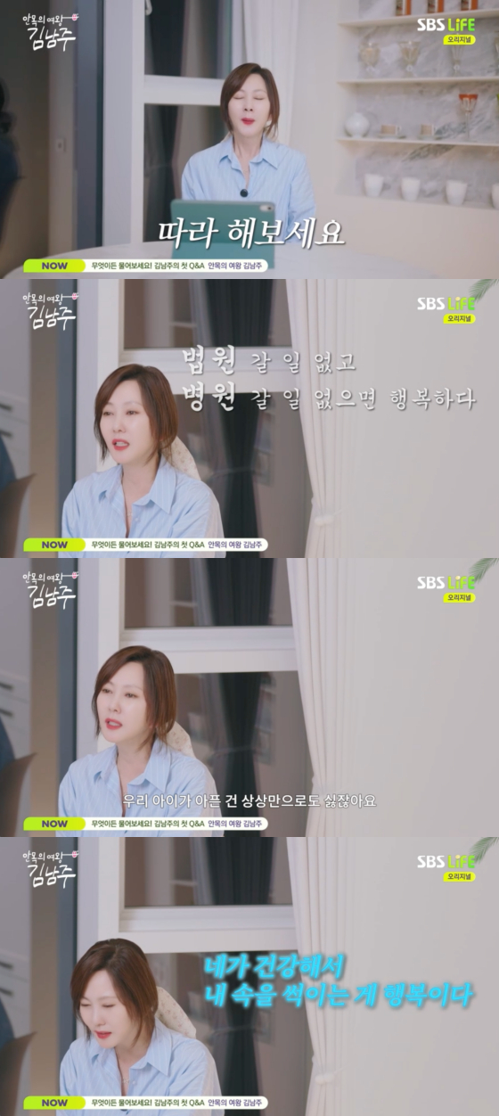 이에 김남주는 "법원 갈 일 없고 병원 갈 일 없으면 행복하다고 생각해라. 아이가 아픈 건 상상만으로도 싫지 않나"라고 답했다.
