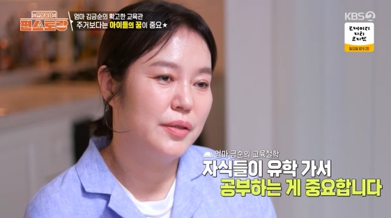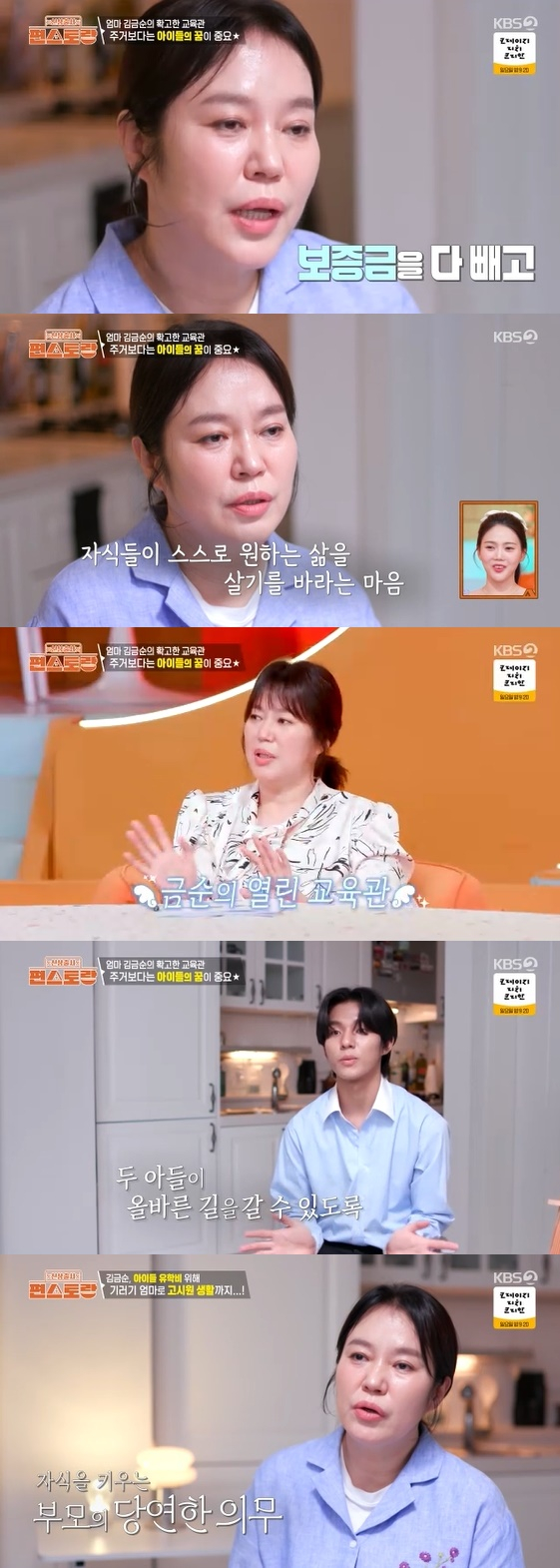 김금순은 기러기 엄마 생활을 고백하며 "고시원에서 살고 원룸에 살고, 아는 분 집에 얹혀살았다. 보증금 다 빼서 유학비로 썼다. 헌신이라기보다 엄마의 당연한 의무다. 지원과 응원이 없으면 앞으로 나아가기가 쉽지 않다"고 자녀들에 대한 애정을 드러냈다.